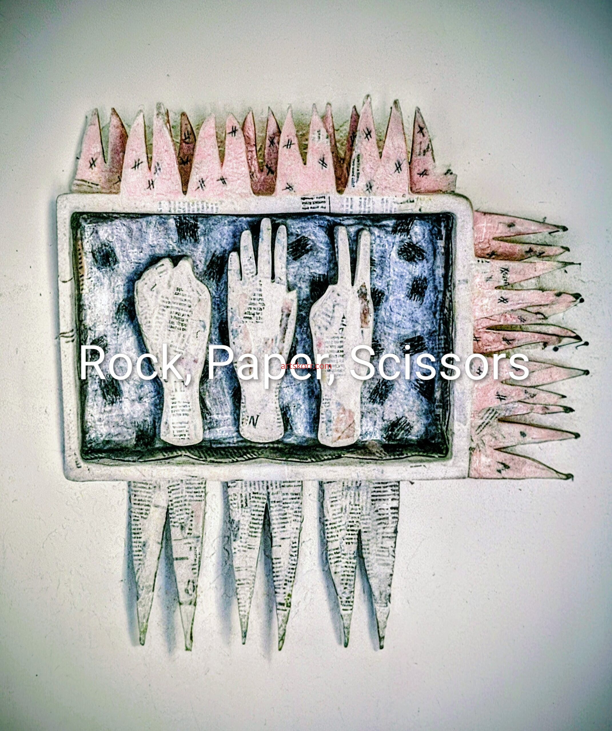 So I’ve decided to use daily thoughts and observations as material for current work. The inspiration for “Rock, Paper, Scissors” came to me on a day recently when I was thinking about choice and how so many people have so little. It’s about ‘being caught between a rock and a hard place”. I used drawings, paint, paper mache and pencil to construct this piece. Please comment!